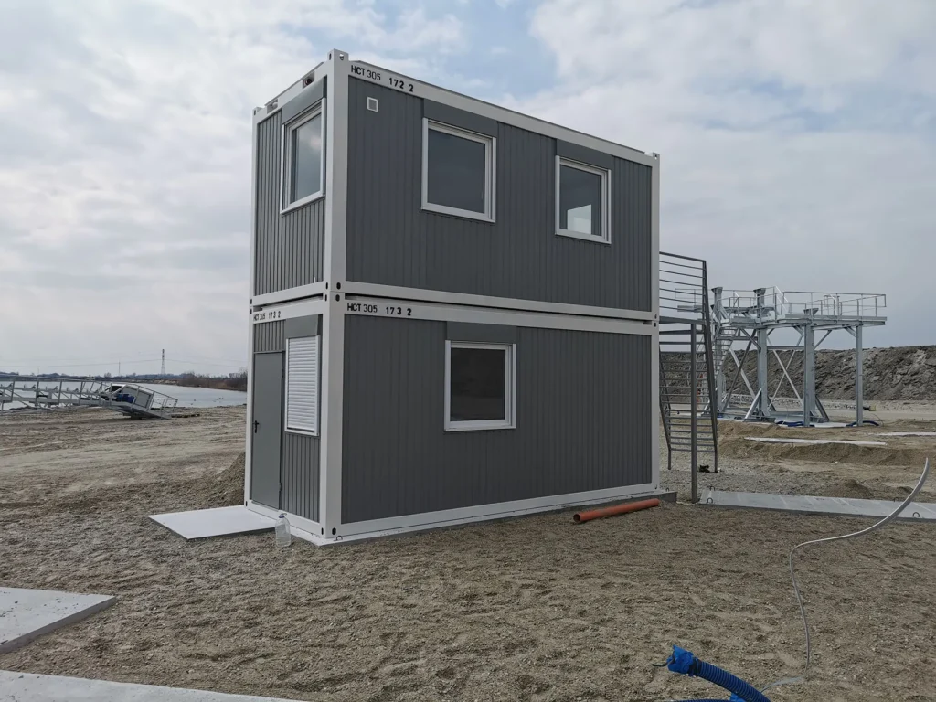 Pre nášho zákazníka sme vyrobili modulárny kontajnernový systém s vonkajším schodiskom, ktorý kombinuje sanitárny kontajner so sprchou a toaletou s spodnej časti a následne na poschodí kancelársky kontajner so štandardným zariadením.