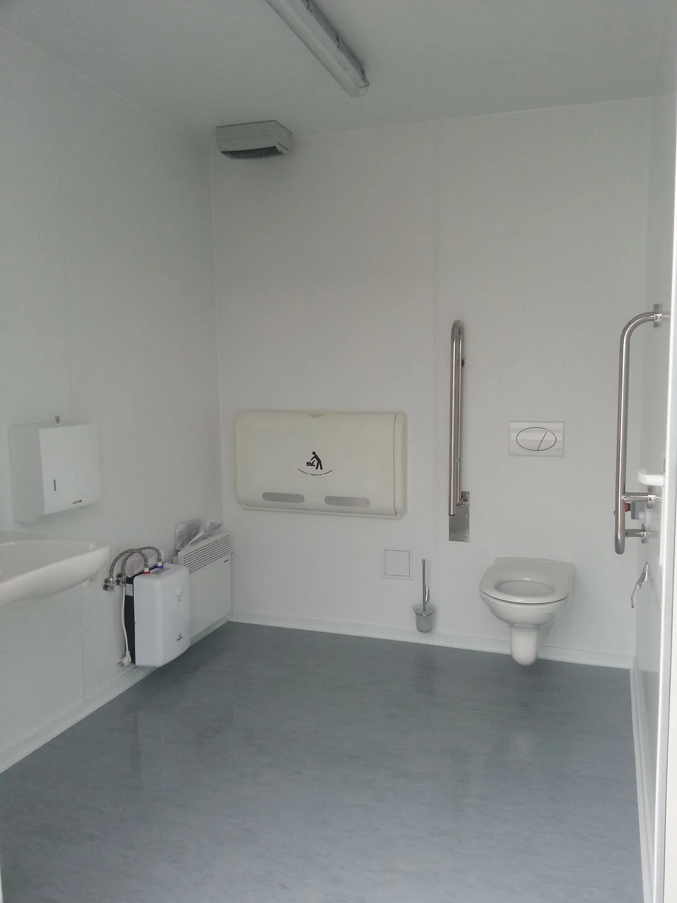 Výroba bezbariérovej toalety typu HCT-150-WCB v tmavo zelenej farbe. Kontajner obsahuje komfortné vybavenie (umývadlo + zrkadlo, bojler na teplú vodu, kúrenie 2kw konvektorom, prebaľovací stôl, toaletu s pomocnými rukoväťami, osvetlenie, sanitárne okienko).